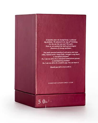 18 months after the kickoff brief, I achieved my perfume. We planned it for my 50th birthday. Are the 50s the new 30s? Not quite. Even so, we avoided the bold and astringent character of vintage perfumes. Our path consisted mostly of cold spices and stone vibes, twisted with a sharp knife. Straight to my heart.
